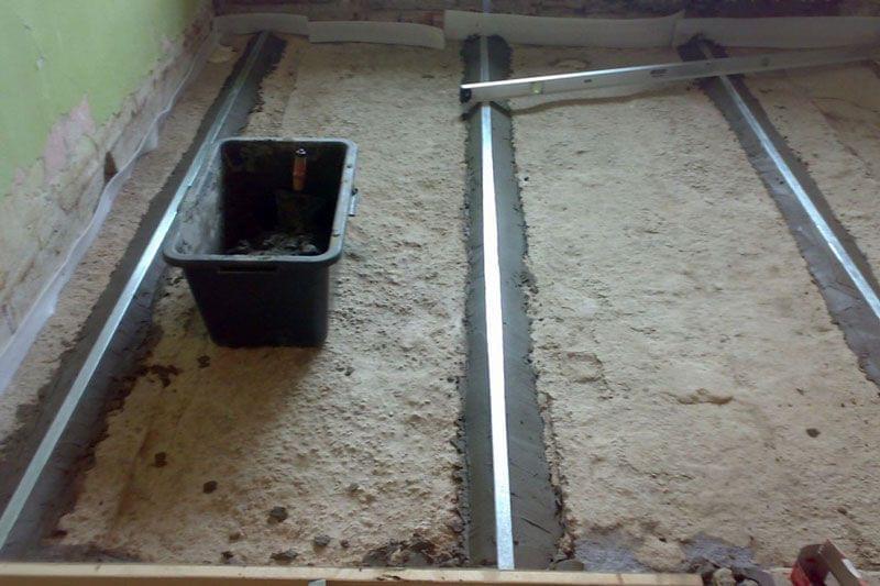 - Укладка смеси. Подготовленный ранее раствор заливается между установленными маяками, разравнивается, утрамбовывается, затирается. Этот процесс может происходить вручную или с применением специального оборудования.